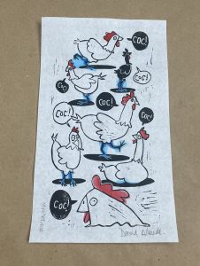 Fifth linocut (etched from a linoleum plate) in black ink on 30g/m2 Wenzhou Paper Pi, madeww from mulberry fiber (kozo). Size: 22 x 22 cm
